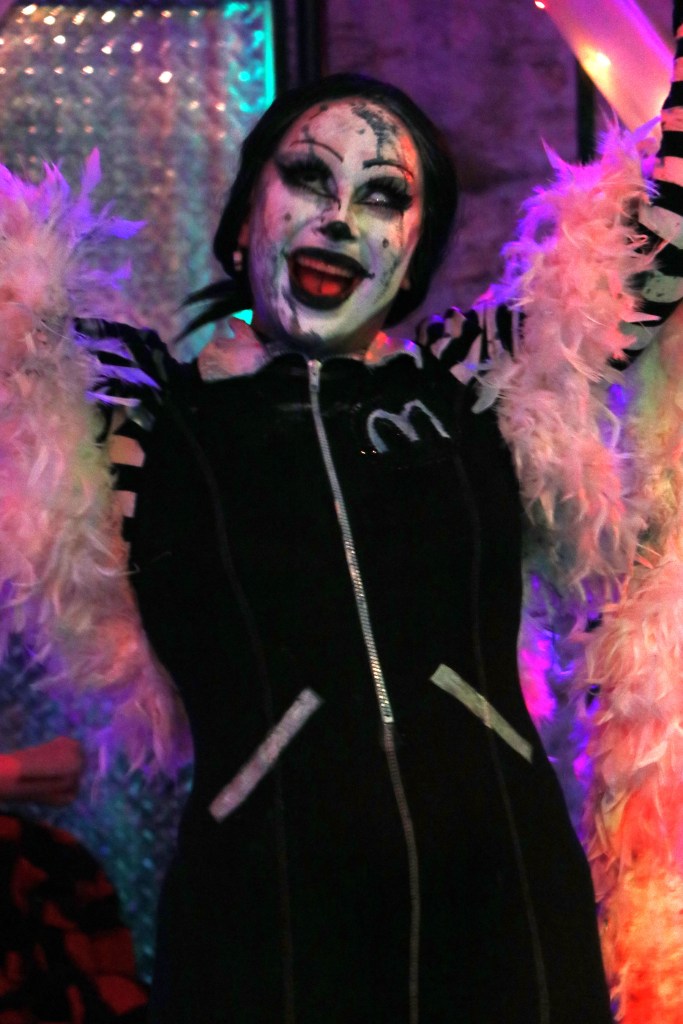 Pour sa première performance, un ami en design de mode lui avait donné une jaquette de psychiatrie pour une performance. Cela s’était produit au bar Les Grands-Ducs de Wellington. En s’est inspirée d’une scène de Night Club, Schizophrenic, en mettant de l’avant sa folie. La Freak du Show a performé pour la première fois sans perruque, avec des verres de contact en forme de X et des pilules de toute sort plein la figure. Ce soir-là, iel était complètement freak et iel a épaté la galerie.